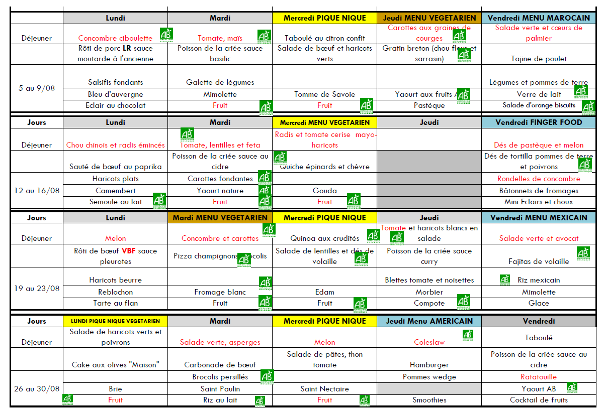 Menus juillet – août 2019 Le vendredi 19 Juil 2019 à 14h16 PM Document(s) à télécharger: Présence des allergènes Les categories associées : MenusJ’aime ma villeAgendasDroits et DémarchesNous contacterAssociationsSolidaritésMenusParole citoyenneTravauxSallesPartager :