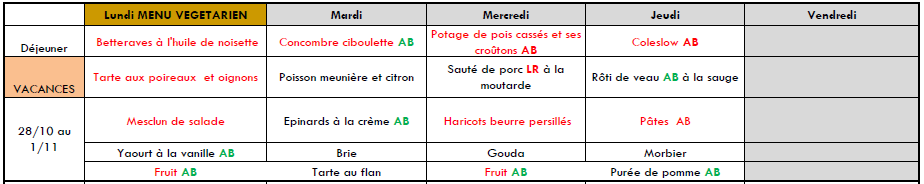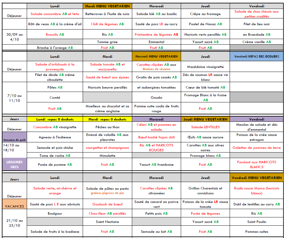Menus octobre 2019 Le lundi 07 Oct 2019 à 15h05 PM Document(s) à télécharger:Présence des allergènes Les categories associées : MenusJ’aime ma villeAgendasDroits et DémarchesNous contacterAssociationsSolidaritésMenusParole citoyenneTravauxSallesPartager :