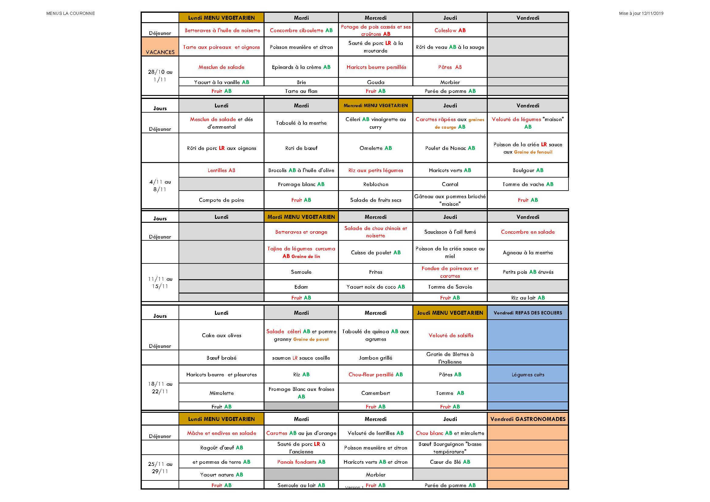 Menus novembre 2019 Le mardi 12 Nov 2019 à 9h27 AM Présence des allergènes Les categories associées : MenusJ’aime ma villeAgendasDroits et DémarchesNous contacterAssociationsSolidaritésMenusParole citoyenneTravauxSallesPartager :