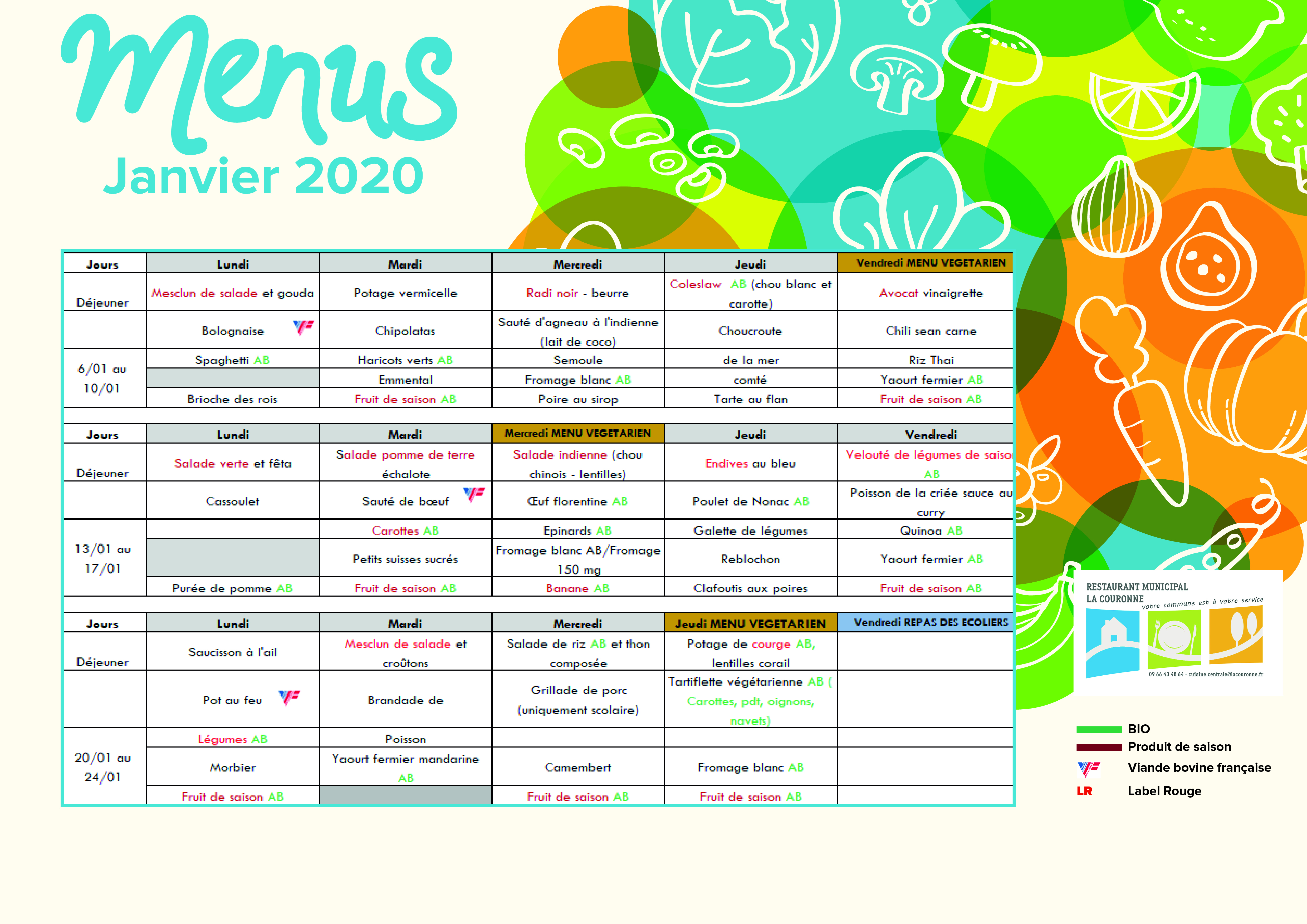 Menus janvier 2020 Le lundi 06 Jan 2020 à 11h34 AM Présence des allergènes Les categories associées : MenusJ’aime ma villeAgendasDroits et DémarchesNous contacterAssociationsSolidaritésMenusParole citoyenneTravauxSallesPartager :