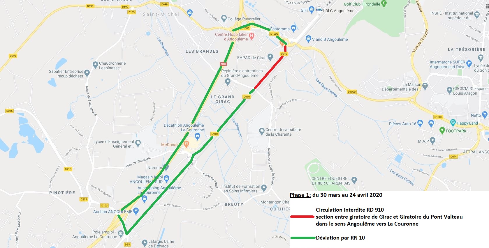 Ces travaux vont se dérouler du 30 mars au 19 juin 2020.  Ils vont nécessiter la fermeture de la route de Bordeaux (RD 910), section entre le giratoire de Girac et le giratoire de l’Université, dans le sens Angoulême vers La Couronne, du 30 mars au 7 mai 2020.