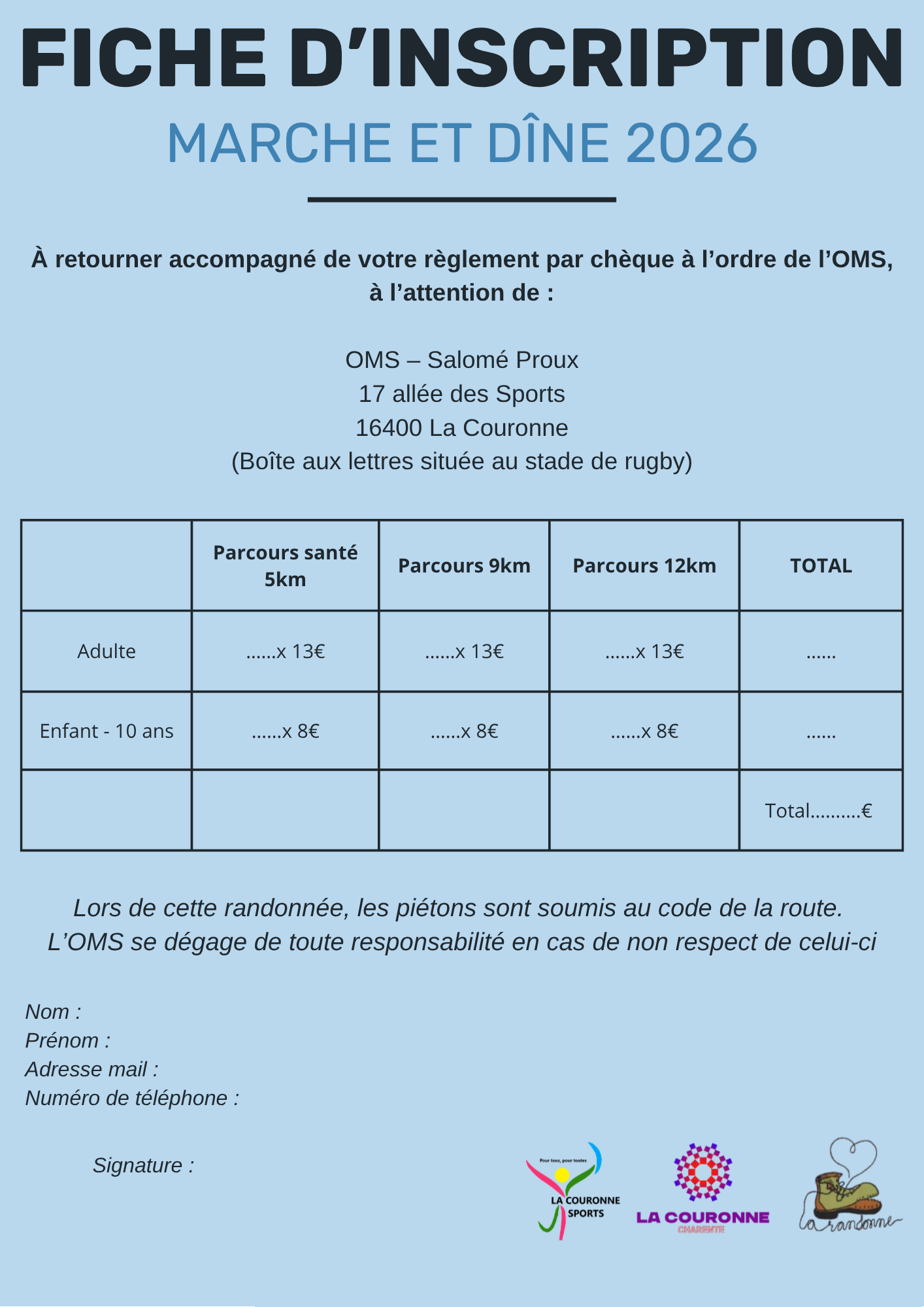 Fiche d’inscription pour la Marche et Dîne 2026 organisée par l’OMS de La Couronne